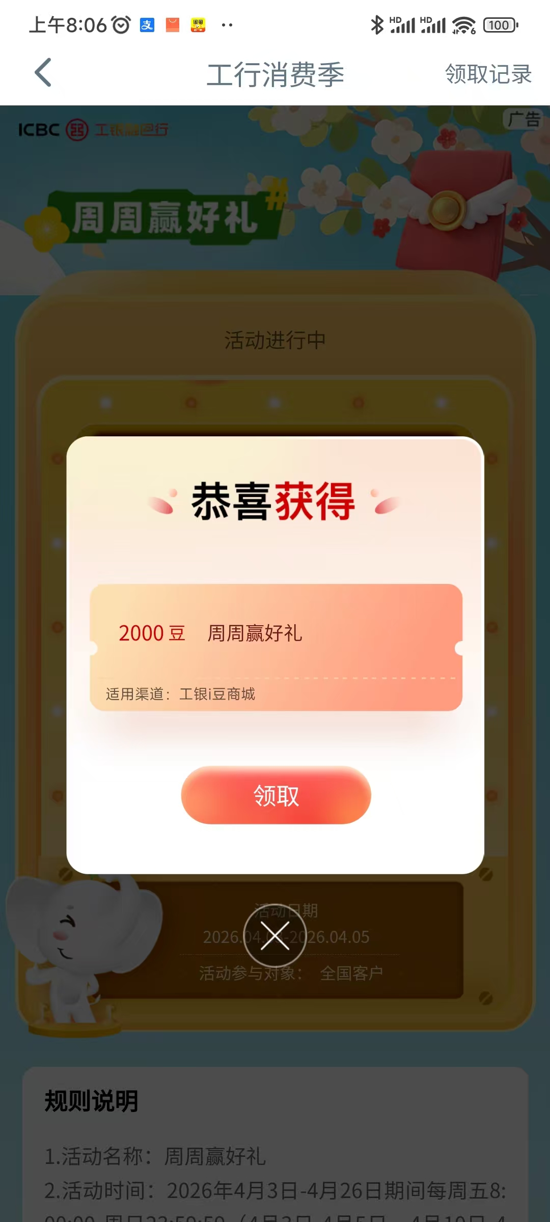 工行搜“工行消费季”抽豆子